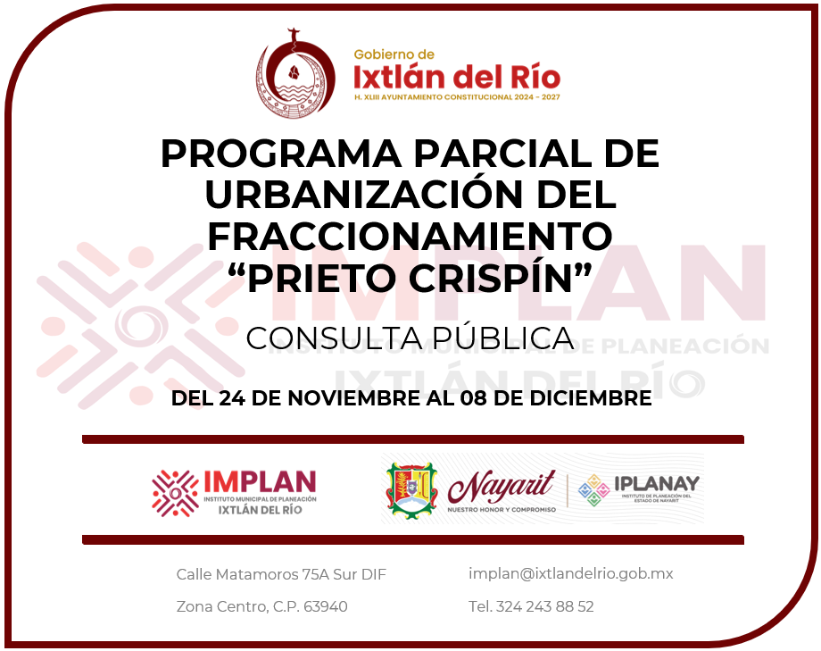 El Instituto Municipal de Planeación de Ixtlán del Río te invita a participar en el proceso de consulta pública referente al Programa Parcial de Urbanización del fraccionamiento "PRIETO CRISPÍN", el cual se pretende desarrollar en el municipio de Ixtlán del Río, Nayarit.